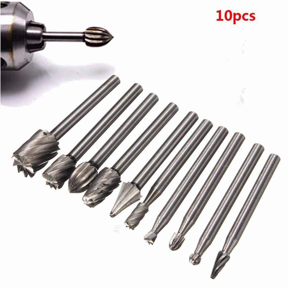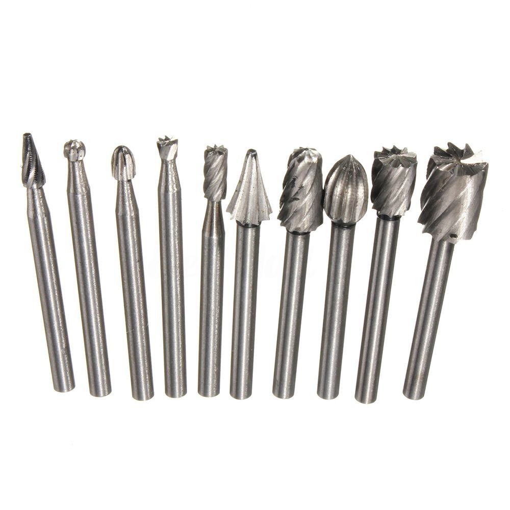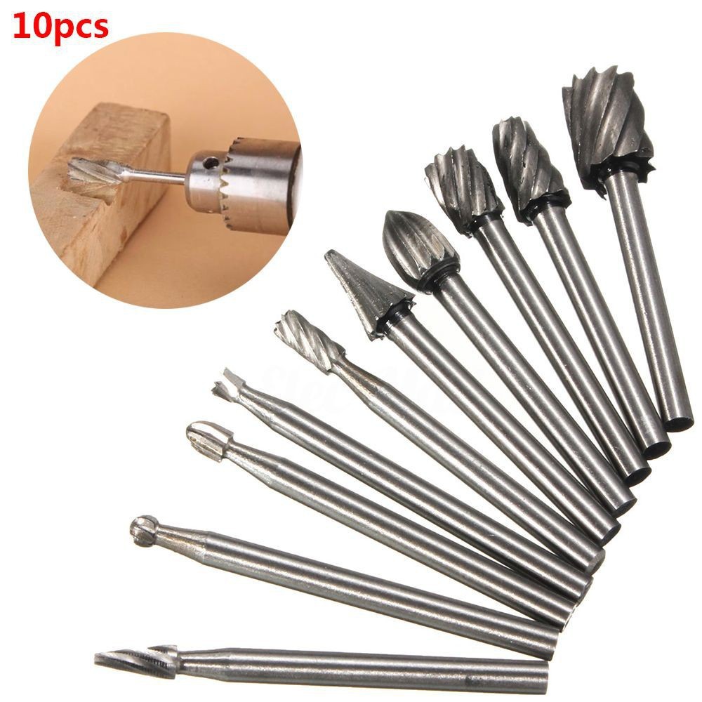 Bộ 10 Mũi Khoan Mài Điêu Khắc Làm Lũa Gỗ dùng để tạo hình, tạo lỗ, rạch khía, làm khe, đục đẽo trên gỗ, kim loại - là phụ kiện không thể thiếu cho máy mài cắt đa năng như Dremel ...Thích hợp dùng cho việc phay cắt, tạo hình gỗ mỹ nghệ, gỗ lũa, mài và loại bỏ các cạnh sắc nét, gờ và vật liệu thừa như nơ via của phôi sau khi gia công. Bộ mũi mài được làm từ thép HSS cao cấp, có độ cứng và tuổi thọ cao hơn khá nhiều so với thép HSS. Sản phẩm có thể sử dụng trên hầu hết các vật liệu cứng khác nhau như sắt thép, nhôm và gang, đá, gốm, sứ, gỗ cứng, acrylics, sợi thủy tinh và nhựa gia cố.