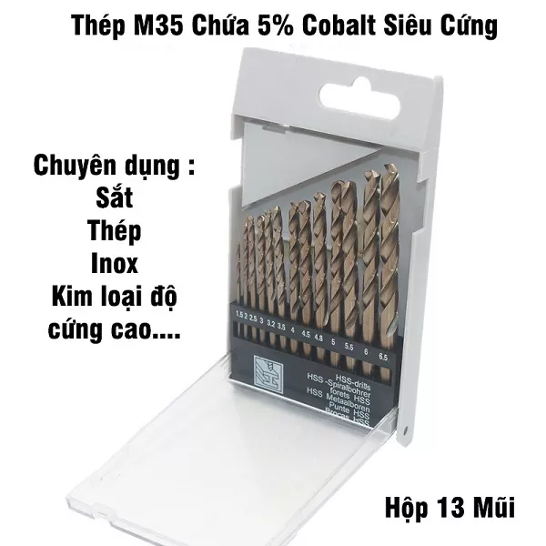 Bộ sản phẩm bao gồm 13 mũi khoan (1.5, 2.0, 2.5, 3.0, 3.2, 3.5, 4.0, 4.5, 4.8, 5.0, 5.5, 6.0, 6.5mm)
