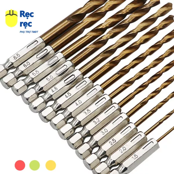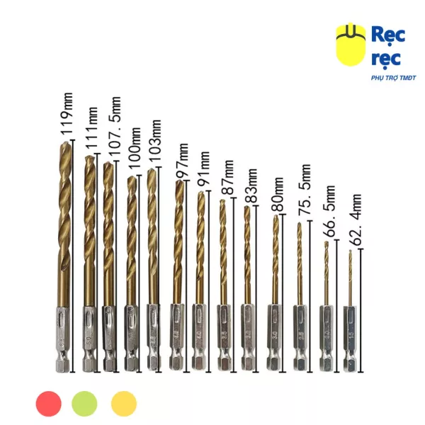 Bộ 13 mũi khoan thép gió tốc độ cao MK13 gồm các mũi khoan: 1.5mm / 0.06 '', 2.0mm / 0.08 '', 2.5mm / 0.10 '', 3.0mm / 0.12 '', 3.2mm / 0.13 '', 3.5 mm / 0.14 '', 4.0mm / 0.16 '' , 4.5mm / 0.18 '', 4.8mm / 0.19 '', 5.0mm / 0.20 '', 5.5mm / 0.22 '', 6.0mm / 0.24 '', 6.5mm / 0.26 ''