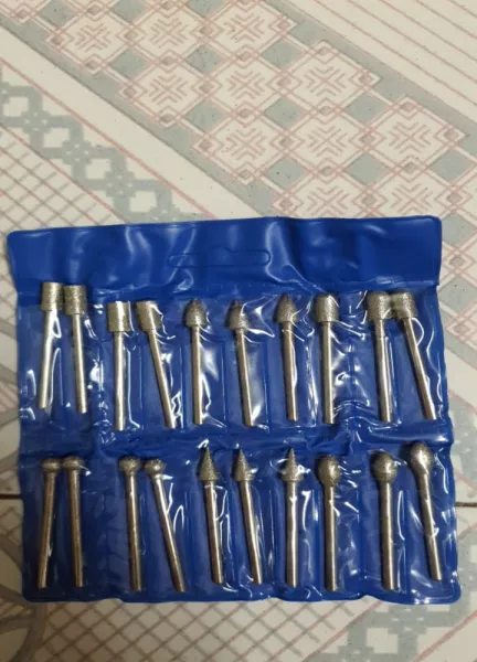 _ Một bộ bao gồm 20 mũi cốt 3mm đầu 6mm, tổng chiều dài mỗi mũi là 45mm với các hình dạng đầu mài khác nhau như: hình trụ đầu phẳng, hình trụ đầu tròn, hình nón cạnh thẳng, hình nón cạnh bo, hình trứng, hình cầu