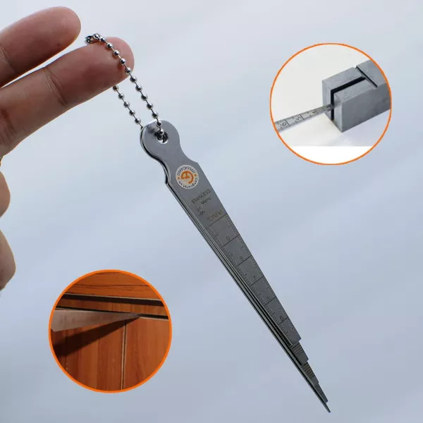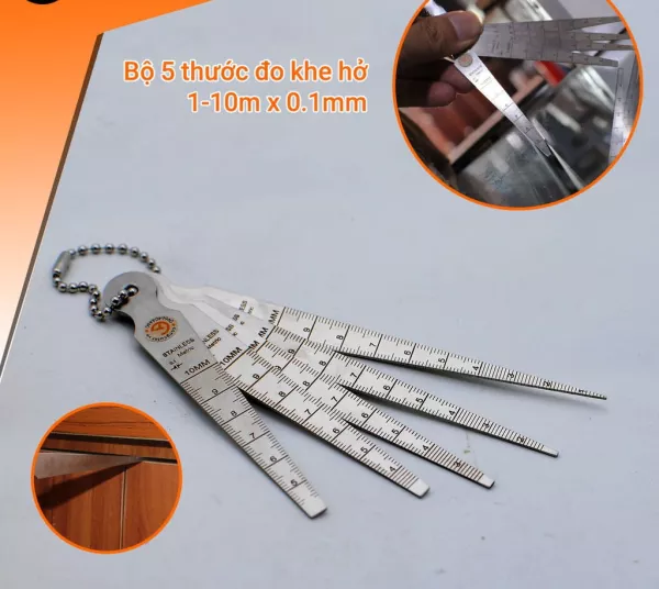 Bộ 5 thước đo ke hở dạng mũi tên với dải đo 1-10mm và độ chính xác 0.1mm được làm bằng thép không gỉ, có móc treo tiện dụng Thước đo ke hở dạng tên 1-10mm là một trong các loại thước đo khe hở , được sử dụng để xác định độ rộng của khe hở, đường kính trong của ống, đường kính trong của các lỗ, độ rộng rãnh giữa các chi tiết. Thước đo khe hở dạng mũi tên dẹt có cách sử dụng hết sức dễ sàng, chỉ cần nhét đầu thước vào khe hở, mép khe hở chạm vào vạch nào thì đó chính là giá trị độ rộng của khe hở Bộ 5 thước đo khe hở bằng thép không gỉ với dải đo 0.5mm đến 10mm, độ chính xác 0.1mm là một sản phẩm khá tiện dụng
