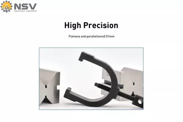 Gia công chính xác tuyệt đối: Các mặt phẳng và rãnh chữ V được mài và rà tinh, đạt độ chính xác phẳng và song song ±0.01mm. Nhờ đó, chi tiết được gá giữ chắc chắn mà không gây biến dạng.