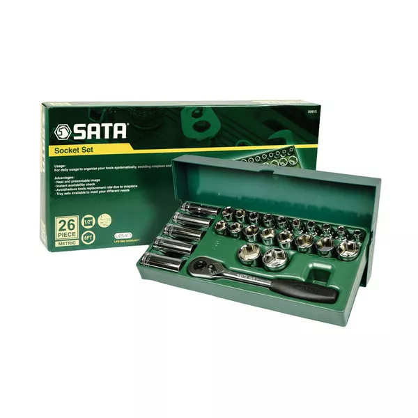 Bộ khay đầu tuýp 26 chi tiết SATA 09915 được làm từ thép hợp kim cứng, rắn chắc, được phủ một lớp chất chống gỉ sét tạo tính bền cực đại. Vỏ hộp làm từ nhựa tổng hợp, tốt, dẻo dai, an toàn, gọn gàng, tiện dụng.