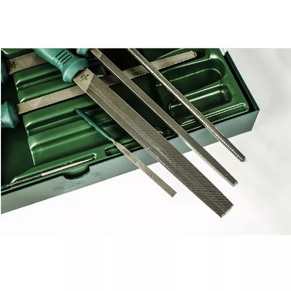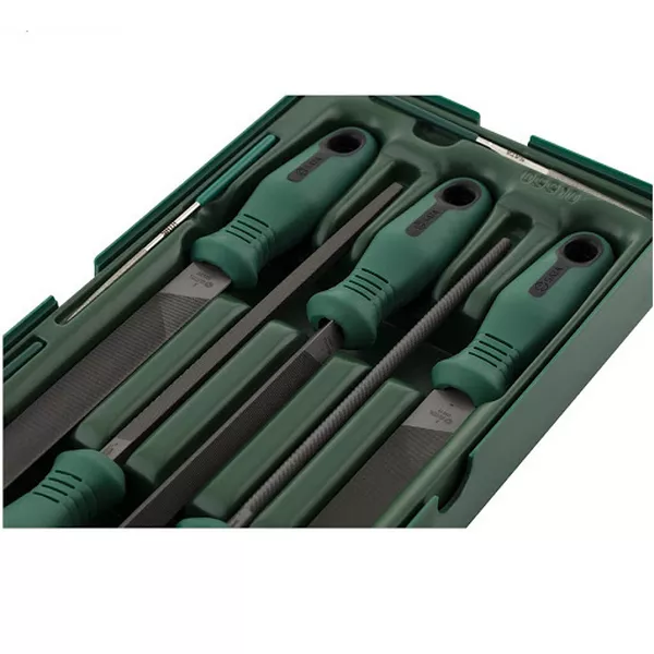 Bộ khay dũa 8 chi tiết SATA 09910 bao gồm: 02 dũa dẹp nhám-mịn | 01 dũa bán nguyệt (Mo) | 01 dũa tròn | 01 dũa tam giác | 03 dũa kim cương 3 x 140mm.