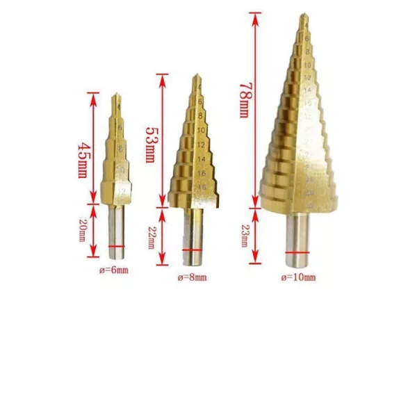 - Bộ sản phẩm này có 3 mũi khoan chóp nón gồm: