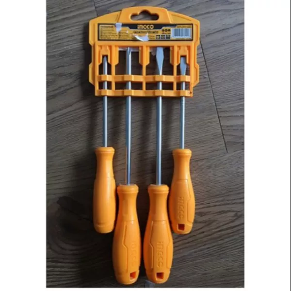 Bộ tuốc nơ vít INGCO HKSD0458 gồm có 4 cây (2 cây dẹp, 2 cây bake), đây là bộ tuốc nơ vít có kiểu dáng tay cầm mới, mang lại sự thoải mái hơn khi sử dụng trong 1 khoảng thời gian dài. Đây là bộ đồ nghề không thể thiếu trong gia đình, cũng như đối với mỗi người thợ, được sử dụng nhiều trong xây dựng, sửa chữa, lắp đặt, bảo dưỡng... Bộ tuốc nơ vít này tuy giá rẻ nhưng được làm bằng chất liệu thép cao cấp chắc chắn, có khả năng chịu nhiệt, chịu lực tác động, va đập mạnh mà không bị biến dạng hay móp méo, có thể gia tăng tuổi thọ khi sử dụng và bảo quản hợp lý.