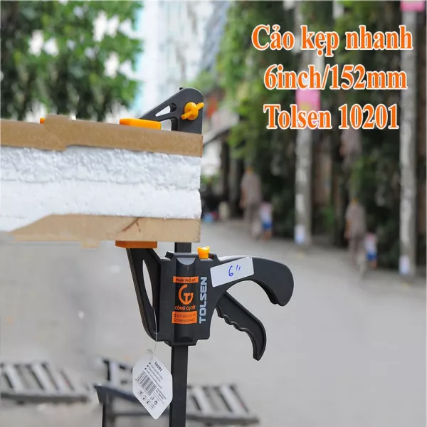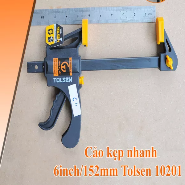 Cảo nhanh Tolsen 10201 là phụ kiện quen thuộc của thợ cơ khí, thợ thủ công chuyên dụng khi cần cố định vật liệu trong quá trình sửa chữa hoặc gia công. Cảo kẹp nhanh được yêu thích bởi tính tiện dụng, nhanh chóng, mang lại hiệu quả gia công tối ưu nhất. Đúng như tên gọi của cảo kẹp nhanh là thao tác rất nhanh do sử dụng cơ chế bóp tay để xiết. Cảo kẹp nhanh này khá phổ biến với xuất xứ đến từ Trung Quốc, phần lớn cảo nhanh được dùng để kẹp nhanh một số tấm vật liệu nào đó mà không cần yêu cầu quá cao về lực như ê tô (lực kẹp dưới 100kg).