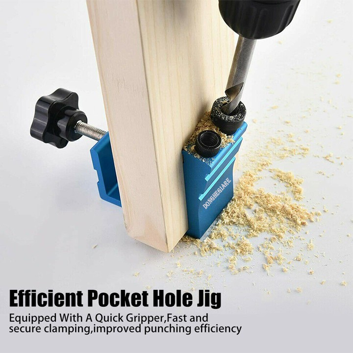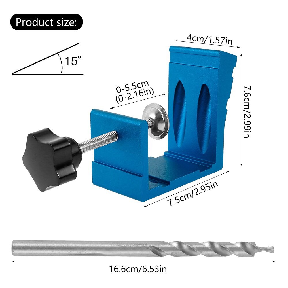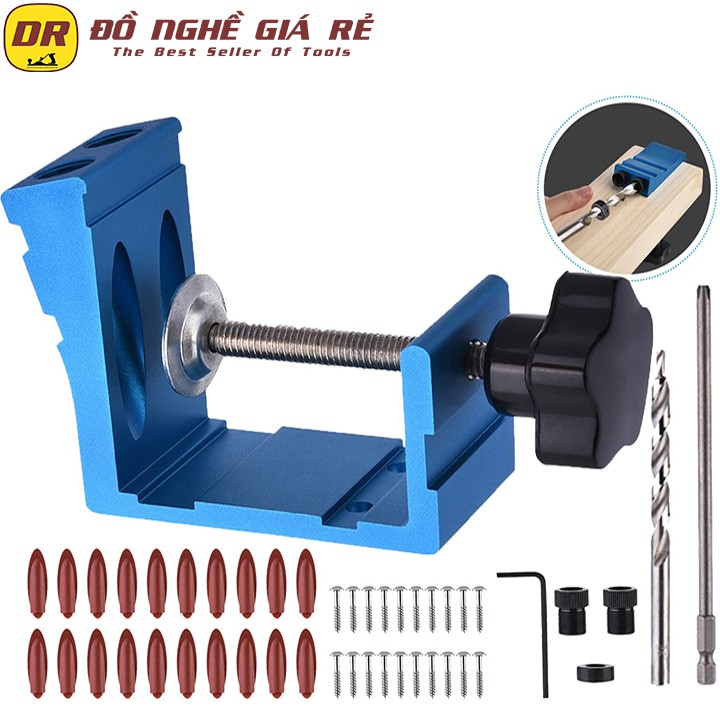 Cữ khoan chéo phiên bản có vam kẹp gỗ. Bộ sản phẩm gồm cữ khoan, mũi khoan 9mm kèm vòng chặn, thanh lục giác, vài con vít khoan chéo và nút bịt lỗ + tặng kèm mũi bắt vít chuôi lục giác dài chuyên dụng. Sản phẩm dùng để hỗ trợ khoan lỗ chéo ghép ván theo nhiều cách: ghép vuông góc, song song, bằng mặt. Thân cữ có chất liệu bằng hợp kim nhôm 6063, các lỗ khoan bằng thép. Cữ khoan chéo giúp thao tác nhanh gọn, hoàn thiện cao cấp, độ chính xác cao với độ bền cao, đầu tư 1 lần sử dụng lâu dài.