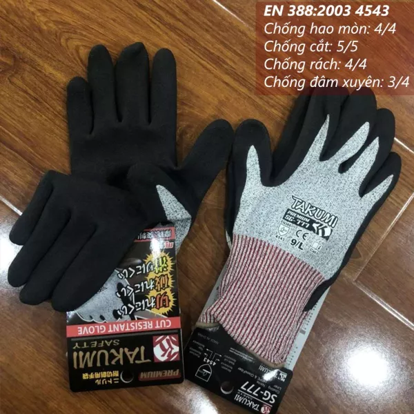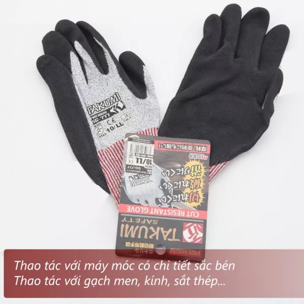 Takumi SG-777 là mẫu găng tay chống cắt cấp độ 5 của thương hiệu Takumi Nhật Bản. Với khả năng chống cắt, chống rách, chống hao mòn tốt, găng tay chống cắt Takumi được ưa chuộng sử dụng trong các công việc tái chế, thao tác với các vật sắc nhọn (kính, thủy tinh, tấm kim loại) sản xuất, lắp ráp ôtô...