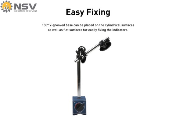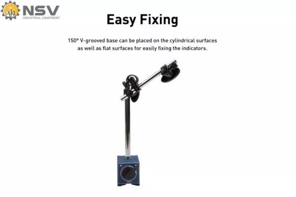 Đế được thiết kế rãnh chữ V 150°, cho phép đặt vững vàng trên bề mặt trụ tròn, ống hoặc mặt phẳng.