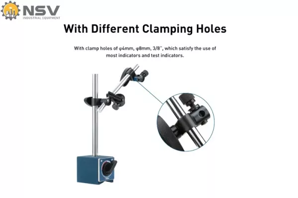 Đế được trang bị lỗ kẹp đa kích thước φ4mm, φ8mm và 3/8”, tương thích với hầu hết các loại đồng hồ so, đồng hồ so tiếp xúc nghiêng và đồng hồ so điện tử.