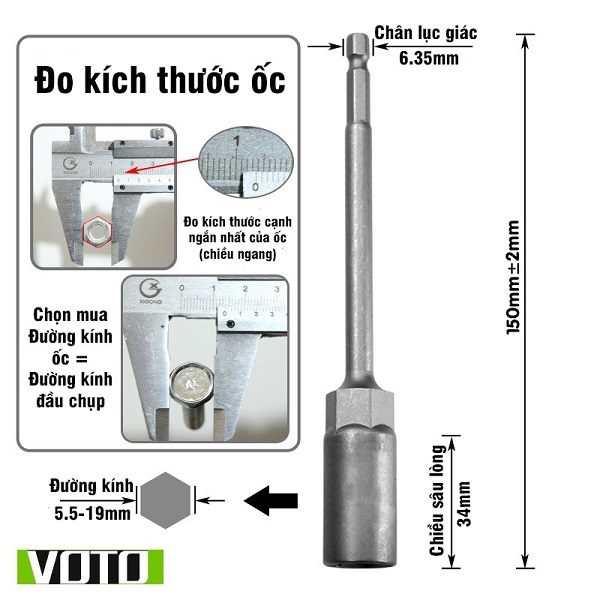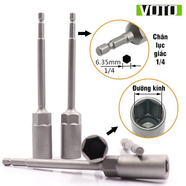 Khẩu Chụp Bulong Sâu Lòng Dài 150mm Bắn Vít Chân Lục Giác Có Nam Châm VOTO Các Kích Cỡ