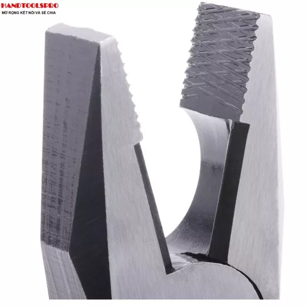 Đầu kìm được thiết kế nhiều răng nhỏ, mục đích để giữ chặt dây điện hoặc giữ chặt bulông để vặn. Và đầu kìm được phủ lớp xi trắng sáng, chống gỉ sét.
