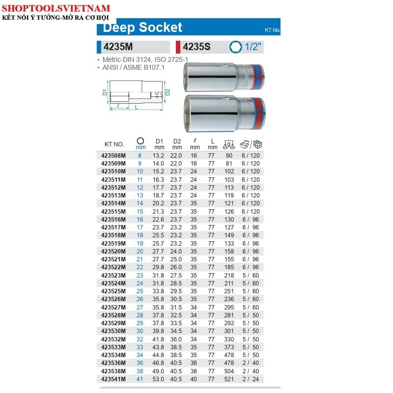Kingtony Đầu Tuýp Trắng Dài 1/2 Inch 6 Cạnh Đủ Size Từ 8-36mm Model 423508M-423536M Chất Lượng Cao