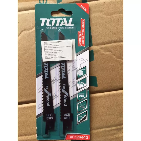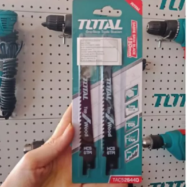 Bộ lưỡi cưa gỗ cho máy cưa kiếm Total TAC52644D gồm có 2 cái, được làm từ hợp kim thép nên có độ cứng cũng như sắc bén cao, sẽ không bị mài mòn và gỉ sét theo thời gian, model này chuyên dùng để cưa gỗ có chiều dài 150mm, tương thích với nhiều dòng máy cưa kiếm đang có trên thị trường hiện nay. Sau 1 hồi sử dụng thì ắt hẳn lưỡi cưa sẽ bị cùn, lúc đó thì ta có thể dùng giũa để mài cho nó sắc bén trở lại cũng được.