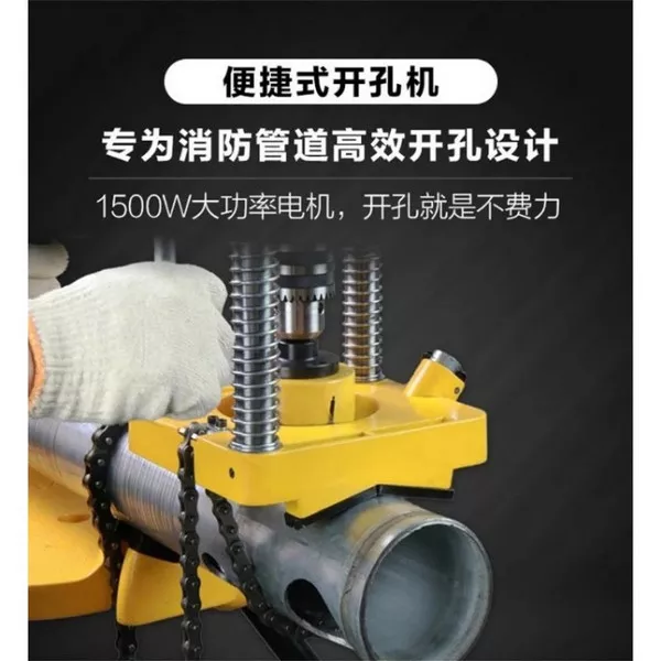 - Máy bắn lỗ MINI KC114 có thiết kế phần chân đế rất đặc biệt, mặt dưới của đế tạo góc chữ V để ôm bề mặt ống, 2 sợi dây xích dùng để cố định chắc chắn máy vào ống cần khoan, nói cách khác phần đế của KC114 không khác gì một chiếc eto chuyên kẹp ống.