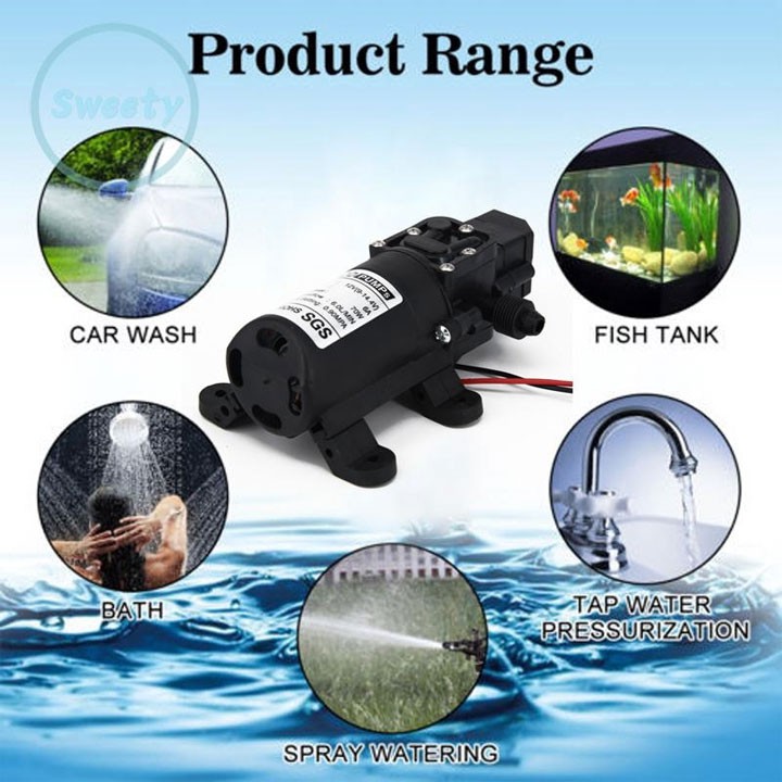 Máy bơm tăng áp mini 12V dùng để bơm nước trợ lực cho máy giặt, máy nước nóng; làm hệ thống phun sương tưới rau, tưới cây, phun thuốc sâu; bơm nước bể cá, hòn non bộ hoặc rửa xe. Sản phẩm có động cơ nam châm vĩnh cửu ổ đĩa máy bơm áp lực cao, kích thước nhỏ, trọng lượng nhẹ, mô-men xoắn lớn, áp suất cao, hoạt động ổn định, lắp đặt dễ dàng, bơm tự mồi được xây dựng với công tắc áp suất tự động, chức năng bảo vệ quá nhiệt, tiếng ồn thấp, axit, kiềm, chống ăn mòn…
