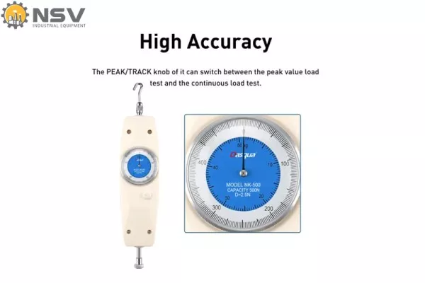 Máy được trang bị chức năng giữ giá trị cực đại (Peak Hold) và chế độ đo liên tục (Track Mode), giúp người vận hành linh hoạt trong việc kiểm tra lực tác động tức thời hoặc lực kéo dài theo thời gian. Người dùng có thể đọc kết quả trực tiếp trên mặt đồng hồ với hai đơn vị Newton (N) và Kilogram (kg) mà không cần quy đổi, đảm bảo sự tiện lợi trong thao tác và đối chiếu dữ liệu.