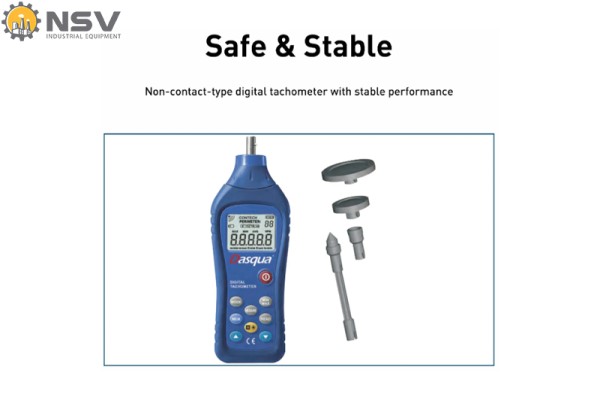 Máy đo tốc độ điện tử không tiếp xúc DASQUA là thiết bị đo lường và kiểm tra chính xác được thiết kế để đo tốc độ quay của các động cơ, trục, máy móc và các bộ phận quay mà không cần tiếp xúc trực tiếp với vật thể. Thiết bị hoạt động dựa trên nguyên lý quang học và cảm biến điện tử, giúp chuyển đổi chuyển động quay thành giá trị số đo RPM (vòng/phút) hiển thị ngay trên màn hình LCD lớn.