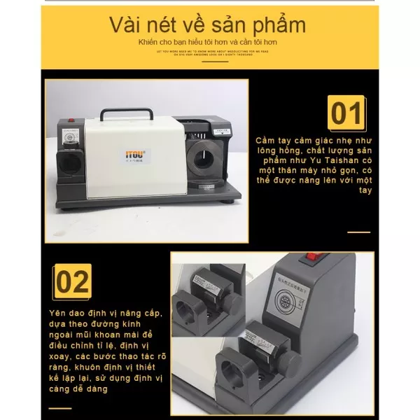 MÁY MÀI MŨI KHOAN ITOU Z26 MÃ MÁY: TX-Z26 THƯƠNG HIỆU: ITOU XUẤT XỨ: TRUNG QUỐC ĐẶC ĐIỂM: - Là loại máy mài mini xách tay, chuyên dùng mài mũi khoan, mũi phay,... - Nghiền chính xác và nhanh chóng, dễ vận hành, không yêu cầu kỹ năng để mài. - Thiết kế cầm tay, dễ thực hiện, ứng dụng được ở các vị trí trong nhà và cả ngoài trời. - Sử dụng đá mài kim cương độ bền cao, đem lại hiệu quả mài vượt trội. THÔNG SỐ KỸ THUẬT - Phạm vi mài: Φ13- Φ26 ( Φ32) mm - Góc đỉnh: 100°(95°)-135° - Nguồn điện: AC220V - Motor: 250W - Tốc độ: 4800 RMP - Bánh mài tiêu chuẩn: CBN ( chuyên dụng cho thép tốc độ cao) hoặc SDC (chuyên dụng cho thép vonfram) - Kích thước đóng gói: 43*23*21 CM - Trọng lượng: 25 KG