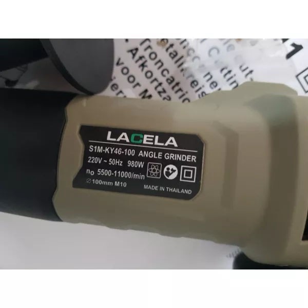 - Máy mài tốc độ Lacela làm việc với công suất 980W, tốc độ không tải 11.000 vòng/phút. Máy sở hữu chế độ khoan xoay và khoan búa, thích hợp để người dùng thao tác trên các bề mặt vật liệu như gỗ, tường, bê tông.