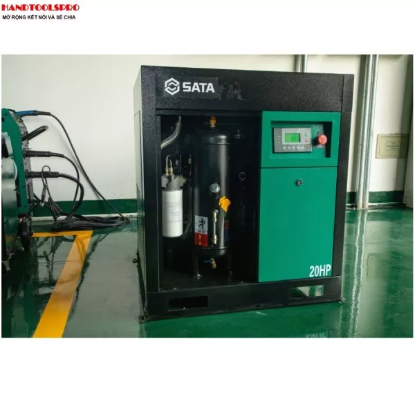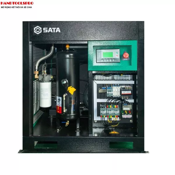 Máy nén khí dạng hình hộp Sata AE5813 hoạt động với cơ chế nén trục vít, máy được trang bị động cơ với công suất 15KW được làm mát bằng không khí bởi các quạt thổi làm mát mạnh mẽ.