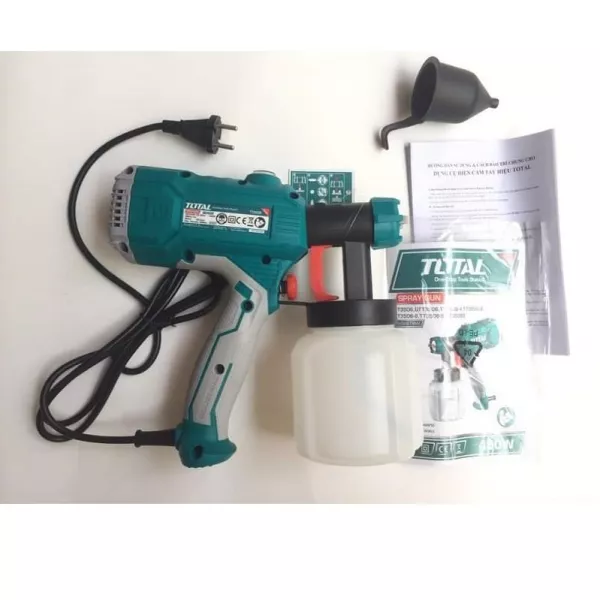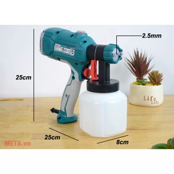 - Súng phun sơn Total TT3506 hoạt động bằng nguồn điện, là dụng cụ chuyên dùng của những thợ sơn trong công việc hàng ngày. Máy phun sơn này có kích thước nhỏ gọn, tính cơ động cao, dễ dàng mang theo khi có việc cần xài tới. Máy có năng suất phun trung bình với thiết kế tay cầm được bọc lớp cao su êm, có độ ma sát cao để hạn chế trơn trượt khi chẳng may tay chảy mồ hôi hoặc dính dầu nhớt trong quá trình sử dụng.