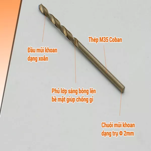 Đầu mũi khoan dạng xoắn, đường kính khoan 2mm