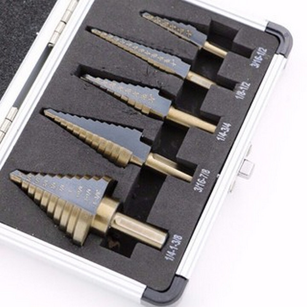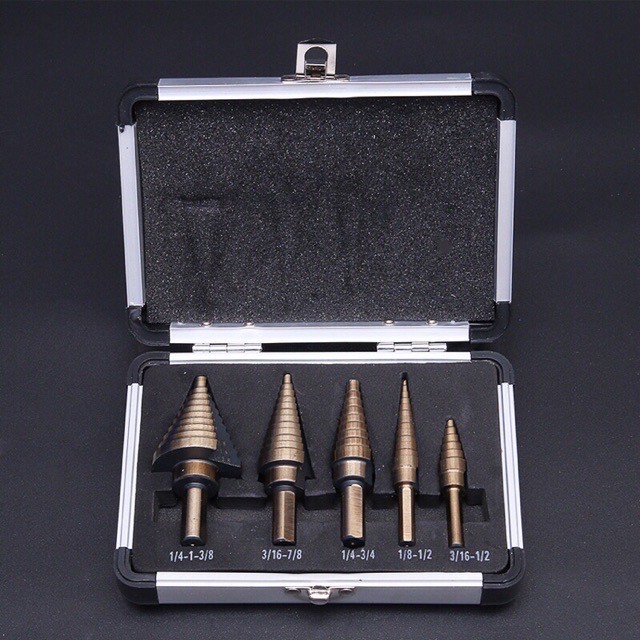 Hộp 5 mũi khoan bước HSS cao cấp với vật liệu thép gió HSS4241 cô ban là bộ mũi khoan lý tưởng để khoan khối, khoét lỗ tấm dày do khả năng chịu nhiệt của đầu khoan lớn. Kích thước mũi khoan hệ inch từ 1/8 đến 1 - 3/8 inch