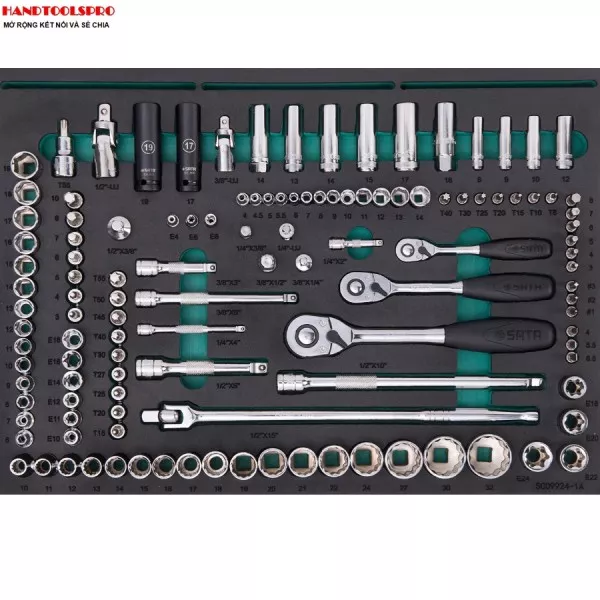 - 14 đầu tuýp lục giác 3/8” với kích thước 6, 7, 8, 9, 10, 11, 12, 13, 14, 15, 16, 17, 18, 19mm.