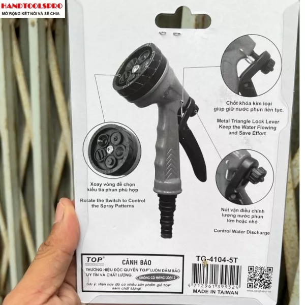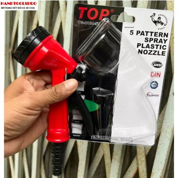 - Dụng cụ phun nước tưới cây và rửa xe 5 tia TOP rất thích hợp để sử dụng trong vườn nhà bạn, sản phẩm được thiết kế theo dạng súng nhầm mục đích tạo sự thuận lợi cho người dùng có thể phun nước liên tục hoặc tạm ngưng nhưng không cần phải khóa nguồn nước