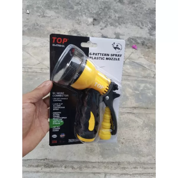 - Dụng cụ phun nước tưới cây và rửa xe 6 tia TOP rất thích hợp để sử dụng trong vườn nhà bạn, sản phẩm được thiết kế theo dạng súng nhầm mục đích tạo sự thuận lợi cho người dùng có thể phun nước liên tục hoặc tạm ngưng nhưng không cần phải khóa nguồn nước.